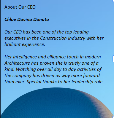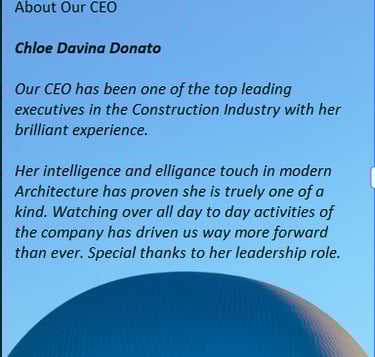 We wanted to set a new, high standard and work as consultants, solving our client's problems. We have one of the best C.E.O as Ms. Chloe Davina Donato has contributed towards the growth and development of our services in terms of modern Architectural Development and to continue the legacy and footprint which her father left. May his soul rest in Peace.